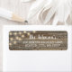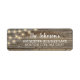 Rustik returadressetikett har mörk trätryck, sträng ljus och vit typografi.