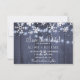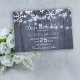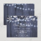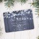 Chicens moderna vinterbröllop sparar datumkortsmallen med vitt snöflingor och hängande tvillinkle ljus på mörk blått grått-linnans träbakgrund. Perfekt för en rustig elegant i land vinter | säsong under det område som utlöstes av bröllop.