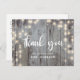 Rustic ljus duschar ner på mörk grått wood med manuset "tack" möhippa vycard. Meddelandet kan anpassas eller tas bort för handskrivet meddelande.
