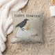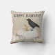En rustisk höstkudde med neutralt vita pumpor, svart kråka och Lycklig Harvest-text på en bakgrund av stil som är täckt av en säck. Ett mysigt jordbrukshus för boenderum, entryvägsbänkar eller säsong-décor - perfekt för höstdekoration från fallsammankomster till Thanksgiving.