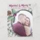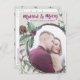 Fira din första gifta jul med det här stilarna helgdag-fotokortet med rustik vattenfärg och med texten "Married & Merry" i plumkalligrafteckensnittet med redigerbar text och ställe för ditt keepsakefoto med en björksnok, holly och gräs cone-krans på gråttets bakgrund med ogenomskinlig övertäckning som tillval. Kompletterande mönster på baksidan.