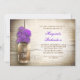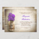 Romantisk rustisk träbakgrund och Mason burk med lila blommor inbjudningskort för möhippa. Jag föreslår ett vackert struktur papper för detta.