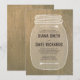 Cute rustic mason burk land-inbjudningskort för att matcha ditt vanliga bröllop-tema. Perfekt inbjudan söt och avslappnad stil, med trendig typografi och söt burk teckning med hand plockade kärlek. Bakgrund till naturligt trä struktur.
