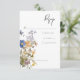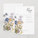 Den här enkla men elegant bröllop-responskortsdesignen har en rustik vattenfärgad bukett av lila, gult, vita och burgunda ängsblommor med grön bakgrund. Det är en del av Rustic Meadow Wildwers Lila Watercolor Bröllop Suite skapat av enbart Farmhouse Press.