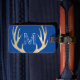 Denna design har en blå bakgrund med hjort antlers och ett grunge monogram på ena sidan och namn och adress på andra sidan.