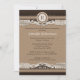 Bröllopsdusch-inbjudningar i säckväv och spets med en rustik design med en över- och underkant med utsmyckad ram och ett monogram högst upp, samt illustrerad spets från båda, över en tryckt design med säckvävstruktur. Informationen om er dusch är personlig under ett texturerat lager för att texten ska se ut som om den är tryckt direkt på säckväv.