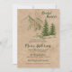 Rustic Mountain Inbjudningskort för möhippan har brunkraftbakgrund. Ett bergsområde med grönt och träd finns längst upp på inbjudan och typsnitt i grönt i roligt typsnitt och formatering under hela inbjudan. Det här är en rustisk bröllopsinbjudan utomhus eller på destinationsorten. Matchande dokument och produkter för den här uppsättningen finns i vår butik.