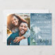 Temapartyets bakgrund sparar datumdesignen med vattenfärgsberg och träd på en mörk dammblå bakgrund. Utformningen har förlovningens foto i förhållandet 5 x 7 och typografin parar traditionell text med modern handskriven text. #SaveTheDate #DustyBlueWedding