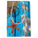 Struktur av blått trä, vingårdar, stjärnfisk av orange, årskal, vit korall och kompass placerade i mitten. En nautisk design med modern tvist.