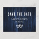 Detta enkla vykort från bröllop spara datum är perfekt för en marin blå rustik land/ladugårdsbröllopsfest.