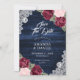 Rustiskt marint blått, burgundärt och bröllop spara datum-kort med baby utandning och burgundy och ro med grön bakgrund på en lada-bakgrund som dekorerats med vit blommigt snöre. Anpassa enkelt den här kortmallen med dina uppgifter om bröllop för att skapa ett unikt kort för rustik blommigt bröllop spara datum för din marinblå, burgundära och bröllopsfest.