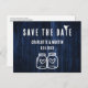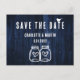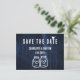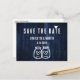 Minimalistiskt vykort i bröllop spara datum med modern kalligrafi som är perfekt för en marin blå rustik land/bakgård/ladugårdsbröllopsfest.
