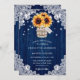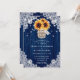 Rustic navy blue solros bröllopsinbjudningar med solros och baby utandning bouquet inuti en mason burk på en lada trä och snöre bakgrund. Utformning av perfekt för att bjuda in dina gäster till ditt marinblå landsbyggsbröllop party inspirerat av solblommor. Enkel att anpassa kortet.
