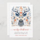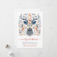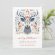 Rustic Nordic Scandi stil-julkort, med dekorerade renar omgivna av blad i blått och rost nyans. God jul i skripttypografi. Lägg till din egen vers och namn. Finns i utskrift, som en digital nedladdning, eller både och!