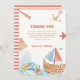 Det är en pojkbabydusch, Nautisk babyduschtema, fira nästa babydusch med vår havsblå och orange söta, roliga, moderna sjöfärgsbåtar vid pirat äventyr, ankare, stjärnfisk, havsvåg, karta, livräddningsgummi ring, krabba i beige färg, bredvid rand mönster. Du kan anpassa din egen text och färg genom att "anpassa den här designen".