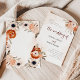De här vackra och romantiska bröllopsinbjudningarna har trendiget boho stil och elegant burgundisk kalligrafi. Rustiska bohemiska buketter av orange, persikor, och taupblommor och neutralt botaniska löv dekorerar hörnen, med matchande subtil vattenfärg stänk på vit bakgrund.