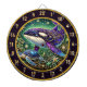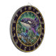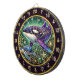 Omvandla din mangrotta eller fiskelott till en skön av rustik elegans med den här orca- och sköldpaddskonsten. Fokpunkten i biet är en stor orca, dess kropp som är mycket detaljerad med lila, guld och blått mönster som påminner om skönheten i nedfläckad glas. Att simma sida vid sida är en serensköldpadda som helt kompletterar det akvatiska temat. Konstruktionen är innesluten i ett cirkulärt ram med ornerade golden-roller, vibrerande gemsten och rostiga accenter. Denna kombination av naturligt inslag och fantasi-inspirerade detaljer gör det till ett utmärkt komplement till alla rekreationsområden. Perfekt för utomhusentusiaster eller fläkt av marint liv, detta konstverk fungerar underbart som en ritbräda eller som en unik visning av väggar. Det sjudande färg och det invecklade hantverket gör att det uppmärksammar och beundrar besökare. Ta med en liten bit av havet och kreativet till ditt spelrum, rum eller människans grotta med denna fantastiska orca- och sköldpaddsdeka.