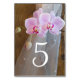 Lägg till en charm till din ranch stil möhippa- eller giftermål-mottagning med avslappnaden ännu i Bordsnumren Rustic Orchid Elegance Land Barn Bröllop. Denna informella och elegant utformning har en blommigt foto av rosa Phalaenopsis eller blommans blommar på stjälken med en vit möhippa med en brunt vävt ladugårdstrumsbakgrund.