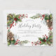 Vacker inbjudan till högtidsfest med en ram av kottar och julbär på vit bakgrund.