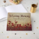 Minnesgäst bok med ett vackert foto av en fullt av vallmo, designad för att se vintage och väven med rävd kant i kombination med vackert typsnitt. Baksidan har en röd gingham mönster. Ryggraden har en färg som matchar vit text.