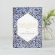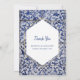Den här konstruktionen har den portugisiska plattan mönster. Texten i bröllop är elegant ramad med en vit och guld färg geometrisk form. Den unika Azulejo-blåa och vita blommigten bröllop tackar dig för kortdesignen med det moderna inslag. Det finns också möjlighet att matcha bröllopsinbjudningar och andra artiklar i kontorsartiklar.