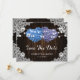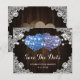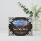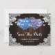 Elegant rustic purple and blue floral wedding save the date card featuring floral hearts against a barn wood background adorned with white floral lace and string lights. Two burlap hearts and delicate floral lace on a rustic wood background at the back.