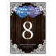 Rustic purple and blue floral wedding table number featuring two floral hearts against a rustic wood background adorned with white floral lace and string lights.