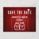 Minimalistiskt vykort i bröllop spara datum med modern kalligrafi som är perfekt för en röd rustik land/bakgård/ladugård-bröllopsfest.