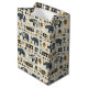 Bold tribal rhino pattern gift bag featuring distressed black rhinoceros silhouettes paired with geometric mudcloth-style motifs in warm tan and charcoal on a textured beige background. A rugged, earthy design ideal for safari enthusiasts, boho decor lovers, and wildlife-inspired style fans.