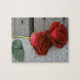 Ett pussel med ett foto av två röd ros över en bakgrund av barnved.