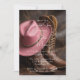 En vackert sammansatt bild som fångar landsbyggsbröllopets innersta väsen och som innehåller ett par finmaskiga bruncowboystövlar parade med en mjuk cowboyhatt ro-färgad. Ställd mot en tålig läderbakgrund. Även ett läder struktur på baksidan av kortet frammanar scenen charm, tradition och western elegans - perfekt för den moderna bruden eller brudgummen som ger lite land flair till sin stora dag.