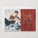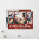 Denna enkla, rustika familjehögtidskort har trendig, avslappnad script-typografi som säger "God Jul" på en festlig röd träliknande bakgrund. Det finns ett rutnät med flera foton med fem foton på framsidan och ytterligare en på baksidan.