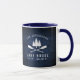 Ett vackert, rustiskt tema kaffe med två ton mugg, som innehåller er familj namn och "Sjö House" eller annan önskad text tillsammans med dess fastställda datum och plats. Den här anpassningsbarna har en unik utformning med en vit silhuett med korsade öron och gräs träd på ett träplankat i rik blå färg. Om du vill se fler design som denna kan du besöka min butik här på "Zazzle.com/Rustic_Charm". Tack.