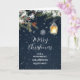 God jul för barnson hans familjekort med rustik vintergrön, vintage lantern och snöflingor mönster på en flotta blå himmel.