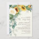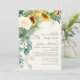 Rustik, men elegant gult solblommor, vit ros och eukalyptus och annan grönsak på en bröllopsinbjudan till botaniska kräm-färgader. Kontakta oss om du behöver hjälp med att anpassa eller matcha produkter. Namnen för briden och trimmen finns i ett elegant-skriptteckensnitt.
