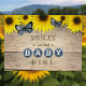 Rustiskt, vävt trä med solroshuvud av gult överst och accenter på baksidan. Blått och vitt flaska-lock av "Baby"-typografi. Mallar skapat åt dig. #zazzlemade, #rustic, #sunblommor, #bottlecaps, #Landsliv