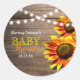 Solrosbabyduschdekal, med en bakgrund av rustiskt trä, två solblommor med gult och orange, stringedd ljus och en mall som är lätt att anpassa.