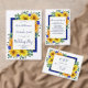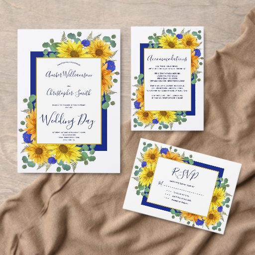 Den här vackra, moderna, strålande designen gör att solblommor, royal blått ro och grönt, inklusive eukalyptus löv och ferns på framsidan, blir till stora buketter. Bakom buketterna finns en rektangel med blå mörk och framför är ett vitt område med guld och anpassadet i djup royal blått i trendig, elegant och sans serif-typografi. Kortets baksida har genomskinliga blommigtar som täcker hörnen och mer anpassade i marinen, inklusive en returadress som förenklar din processaa. Du kan anpassa det här objektet för din speciella händelse genom att ändra texten i produktmallen.