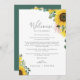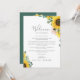 Dessa rustiska solroskort bröllop välkomnar brev och färdkort är perfekt för ett landsbyggsbröllop. Utformningen av den bohemiska blommigten har gult solblommor, blommor i rosan och grönt eucalyptus greenery i vattenfärg med en elegant av modern bohos. På kortets framsida finns ett välkommet brev och på kortets baksida finns en rutt i bröllop. Dessa anteckningar är perfekt för destinationsbröllop och hotellgästväskor.