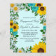Rustic land förlovningsfest-inbjudan med pulserande solblommor, traditionella vita daisy och tealblommor mot en lätt akvatisk bakgrund med baby och botaniska gröna accenter