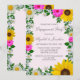 Rustic land förlovningsfest-inbjudan med pulserande solblommor, traditionella vita daisy och rosa blommor mot ljus rosa bakgrund med baby utandning och botaniska gröna accenter