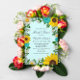 Rustic land inbjudningskort för möhippan med pulserande solblommor, traditionella vita daisy och tealblommor mot en lätt akvatisk bakgrund med baby och botaniska gröna accenter