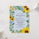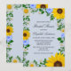 Rustic land inbjudningskort för möhippan med pulserande solblommor, traditionella vita daisy och färglöst blåa blommor mot en ljusdammig blå bakgrund med baby utandning och botaniska gröna accenter