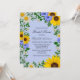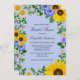 Rustic land inbjudningskort för möhippan med pulserande solblommor, traditionella vita daisy och lätt blåa blommor mot ljusblå bakgrund med baby utandning och botaniska gröna accenter