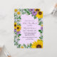 Rustic land mors dag inbjudan med vibranta solblommor, traditionella vita daisy och färgstarka lila blommor mot en ljus lila bakgrund med baby utandning och botaniska gröna accenter