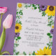 Rustic land mors dag inbjudan med vibranta solblommor, traditionella vita daisy och färgstarka lila blommor mot en ljus lila bakgrund med baby utandning och botaniska gröna accenter