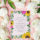 Rustic land mors dag inbjudan med pulserande solblommor, traditionella vita daisy och rosa blommor mot ljus rosa bakgrund med baby utandning och botaniska gröna accenter
