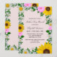 Rustic land mors dag inbjudan med pulserande solblommor, traditionella vita daisy och rosa blommor mot ljus rosa bakgrund med baby utandning och botaniska gröna accenter