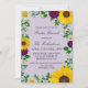 Rustic land Påsk inbjudan med vibranta solblommor, traditionella vita daisy och mörk lila blommor mot en ljus lila bakgrund med baby utandning och botaniska gröna accenter