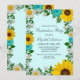 Rustic land studenten inbjudan med pulserande solblommor, traditionella vita daisy och tealblommor mot en lätt akvatisk bakgrund med baby utandning och botaniska gröna accenter